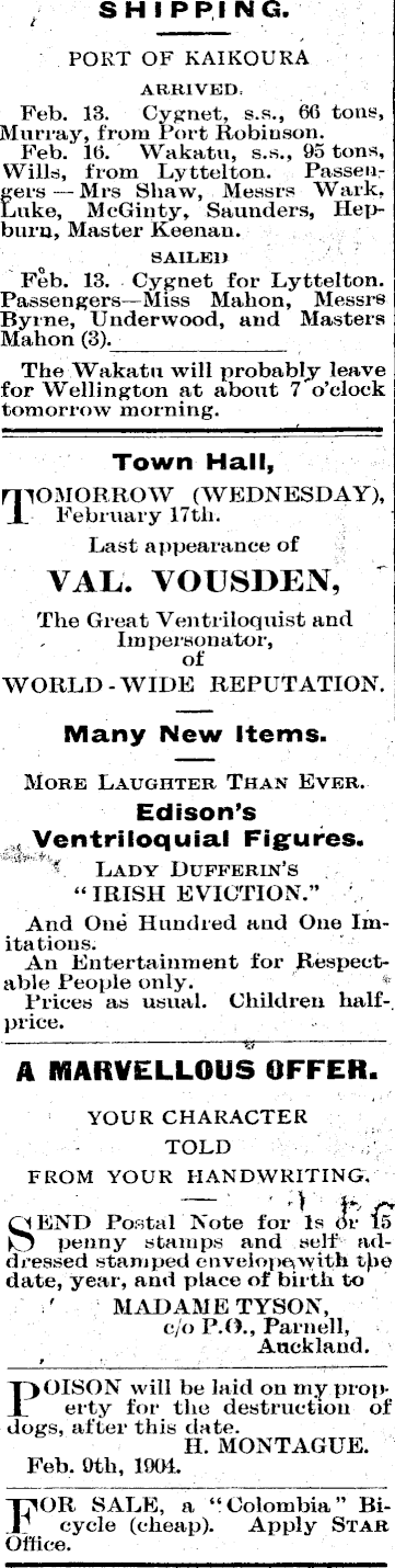 SHIPPING. PORT OF KAIKOURA ARRIVED. Feb. 13. Cygnet, s.s., 66 tons, Murray, from Port Robinson. Feb. 16. Wakatu, s.s., 95 tons, Wills, from Lyttelton. Passen£ers —Mrs Shaw, Messrs Wark, .tike, McGinty, Saunders, Hepburn, Master Keenan. SAILED Feb. 13. Cygnet for Lyttelton. Passengers—Miss Mahon, Messrs Byrne, Underwood, and Masters Mahon (3)._ The Wakatu will probably leave for Wellington at about 7 o’clock tomorrow morning. Town Hall, rpOMORROW (WEDNESDAY), X February 17th. Last appearance of VAL. VOUSDEN, The Great Ventriloquist and Impersonator, of WORLD - WIDE REPUTATION. Many New Items. More Laughter Than Ever. Edison’s Ventriloquial Figures. Lady Dufferin’s “ IRISH EVICTION.’’ And One Hundred and One Imitations. An Entertainment for Respectable People only. Prices as usual. Children half-, price. A MARVELLOUS OFFER. YOUR CHARACTER TOLD FROM YOUR HANDWRITING. ■ i f* z* SEND Postal Note for Is Or 15 penny stamps and self addressed stamped envelope with the date, year, and place of birth to MADAME TYSON, c/o P. 0., Parnell, Auckland. POISON will be laid on my property for the destruction of dogs, after this date. 11. MONTAGUE. Feb. 9th, 1904. FOR SALE, a “Colombia” Bicycle (cheap). Apply Star Office.