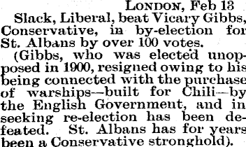 London, Feb 13 Slack, Liberal, beat Vicary Gibbs, Conservative, in by-election for St. Albans by over 100 votes. (Gibbs, who was elected unopposed in 1900, resigned owing to his being connected with the purchase of warships—built for Chili—by the English Government, and in seeking re-election has been defeated. St. Albans has for years been a Conservative stronghold).