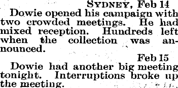 Sydney, Feb 14 Dowie opened his campaign with two crowded meetings. He had mixed reception. Hundreds left when the collection was announced. Feb 15 Dowie had another big meeting tonight. Interruptions broke up the meeting. «