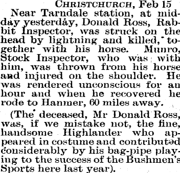 Christchurch, Feb 15 Near Tarndale station, at midday yesterday, Donald Ross, Rabbit Inspector, was struck on the head by lightning and killed,"together with his horse. Munro, Stock Inspector, who was with him, was thrown from his horse and injured on the shoulder. He was rendered unconscious for an hour and when he recovered he rode to Hamner, 60 miles away. (The’ deceased, Mr Donald Ross, was, if we mistake not, the fine, handsome Highlander who appeared in costume and contributed Considerably by his bag-pipe playing to the success of the Bushmen’s Sports here last year).