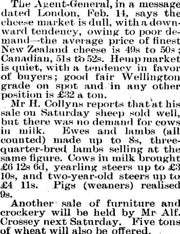 The Agent-General, in a message dated London, Feb. 14, says the cheese ma rket is dull, with a downward tendency, owing to poor demand —the average price of finest New Zealand cheese is 49s to 50s ; Canadian, 51s tb 525. Hemp market is quiet, with a tendency in favor of buyers; good fair Wellington grade on spot and in any other position is £32 a ton. Mr H. Collyns reports that at his sale on Saturday sheep sold well, but there was no demand for cows in milk. Ewes and lambs (all counted) made up to Bs, three-quarter-bred lambs selling at the same figure. Cows in milk brought £6 12s 6d, yearling steers up to £3 10s, and two-year-old steers up to £4 Ils. Pigs (weaners) realised 9s. Another sale of furniture and crockery will be held by Mr Alf. Crossey next Saturday. Five tons of wheat will also be offered.