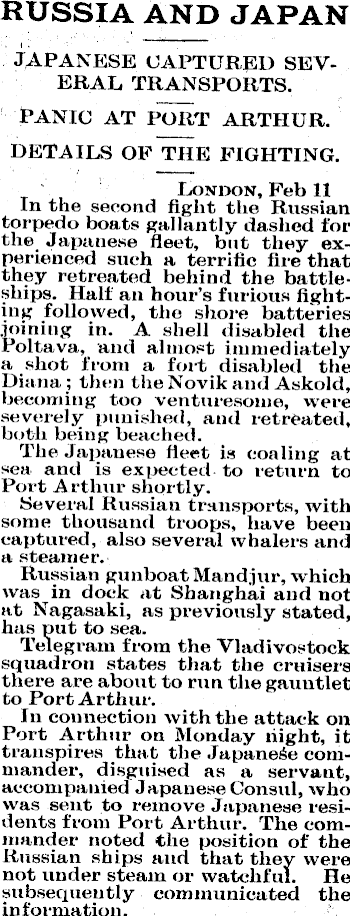 RUSSIA AND JAPAN JAPANESE CAPTURED SEVERAL TRANSPORTS. PANIC AT PORT ARTHUR. DETAILS OF THE FIGHTING. London, Feb 11 In the second fight the Russian torpedo boats gallantly dashed for the Japanese fleet, but they exnerienced such a terrific fire that they retreated behind the battleships. Half an hour’s furious fighting followed, the shore batteries joining in. A shell disabled the Poltava,_ and almost immediately a shot from a fort disabled the Diana ; then the Novik and Askold, becoming too venturesome, were severely punished, and retreated, both being beached. The Japanese fleet is coaling at sea and is expected to return to Port Arthur shortly. Several Russian transports, with some thousand troops, have been captured, also several whalers ami a steamer. Russian gunboat Mandjur, which was in dock at Shanghai and not at Nagasaki, as previously stated, has put to sea. Telegram from the Vladivostock squadron states that the cruisers there are about to run the gauntlet to Port Arthur. In connection with the attack on Port Arthur on Monday flight, it transpires that the Japanese commander, disguised as a servant, accompanied Japanese Consul, who was sent to remove Japanese residents from Port Arthur. The commander noted the position of the Russian ships and that they were not under steam or watchful. He subsequently communicated the information.