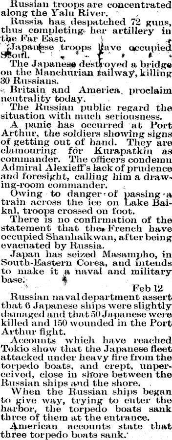 Russian troops are concentrated along the Yalu River. Russia has despatched 72 guns, thus completing her artillery in the Far East. flapanfese troops Rave occupied Sjßoiil. r e • The Japanese destroyed a bridge on the Manchurian railway, killing 30 Russians. Britain and America, proclaim neutrality today. The Russian public regard the situation with much seriousness. A panic has occurred at Port Arthur, the soldiers showing signs of getting out of hand. They are. clamouring for Kurapatkin as commander. The officers condemn Admiral Alexieff’s lack of prudence and foresight, calling him a draw-ing-room commander. Owing to danger of passing a train across the ice on Lake Baikal, troops crossed on foot. There is no confirmation of the statement that the. French have occupied Shanhaikwan, after being evacuated by Russia. Japan has seized Masampho, in South-Eastern Corea, and intends to make it a naval and military base. Feb 12 Russian naval department assert that 6 Japanese ships were slightly damaged and that 50 Japanese were killed and 150 wounded in the Port Arthur fight. Accounts -which have reached Tokio show that the Japanese fleet attacked under heavy fire from the torpedo boats, and crept, unperceived, close in sh'ore between the Russian ships and the shore. When the Russian ships began to give way, trying to enter the harbor, the torpedo boats sank three of them at the entrance. American accounts state that three torpedo boats sank."