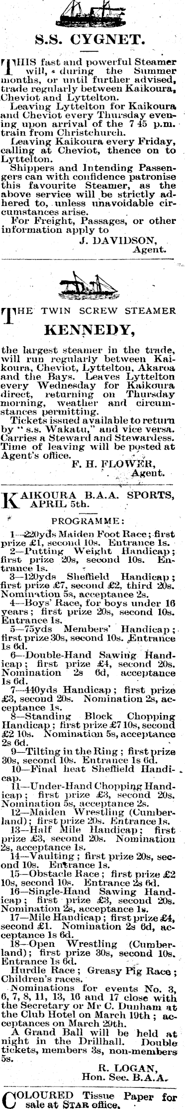 S.S. CYGNET. rnHIS fast and powerful Steamer I will, during the Summer months, or until further advised, trade regularly between Kaikoura, Cheviot and Lyttelton. Leaving Lyttelton for Kaikoura and Cheviot every Thursday evening upon arrival of the 7 45 p.m. train from Christchurch. Leaving Kaikoura every Friday, calling at Cheviot, thence on to Lyttelton. Shippers and Intending Passengers can with confidence patronise this favourite Steamer, as the above service will be strictly adhered to, unless unavoidable circumstances arise. For Freight, Passages, or other information apply to J. DAVIDSON, Agent. rjIHE TWIN SCREW STEAMER KENNEDY, the largest steamer in the trade, will run regularly between Kaikoura, Cheviot, Lyttelton, Akaroa and the Bays. Leaves Lyttelton every Wednesday for Kaikoura direct, returning on Thursday morning, weather and circumstances permitting. Tickets issued available to return by “ s.s. Wakatu,” and vice versa. Carries a Steward and Stewardess. Time of leaving will be posted at Agent’s office. F. H. FLOWER, Agent. Kaikoura b.a.a. sports, APRIL sth. PROGRAMME: 1 -220ydsMaiden Foot Race; first prize £l, second 10s. Entrance Is. 2 —Putting Weight Handicap ; first prize 20s, second 10s. Entrance Is. 3—l2oyds Sheffield Handicap ; first prize £7, second £2, third 20s. Nomination ss, acceptance 2s. 4—Boys’ Race, for boys under 16 years; first prize 20s, second 10s. Entrance Is. s—7syds Members' Handicap; first prize 30s, second 10s. Entrance Is 6d. 6—Double-Hand Sawing Handicap ; first prize £4, second 20s. Nomination 2s 6d, acceptance Is 6d. 7 —44oyds Handicap ; first prize £3, second 20s. Nomination 2s, acceptance Is. B—Standing8—Standing Block Chopping Handicap ; first prize £7los, second £2 10s. Nomination ss, acceptance 2s 6d. 9—Tilting in the Ring ; first prize 30s, second 10s. Entrance Is 6a. 10—Final heat Sheffield Handicap. 11 —Under-Hand Chopping Handicap ; first prize £3, second 20s. Nomination ss, acceptance 2s. 12—Maiden Wrestling (Cumberland); first prize 20s. Entrance Is. 13—Half Mile Handicap; first prize £3, second 20s. Nomination 2s, acceptance Is. 14—Vaulting ; first prize 20s, second 10s. Entrance Is. 15 —Obstacle Race ; first prize £2 10s, second 10s. Entrance 2s 6d. 16—Single-Hand Sawing Handicap ; first prize £3, second 20s. Nomination 2s, acceptance Is. 17 —Mile Handicap ; first prize £4, second £l. Nomination 2s 6d, acceptance Is 6d. 18-Open Wrestling (Cumberland) ; first prize 30s, second 10s. Entrance Is 6d. Hurdle Race ; Greasy Pig Race ; Children’s races. Nominations for events No. 3, 6,7, 8, 11, 13, 16 and 17 close with the Secretary or Mr C. Dunham at the Club Hotel on March 19th ; acceptances on March 29th. A Grand Ball will be held at night in the Drillhall. Double tickets, members 3s, non-members ss. R. LOGAN, Hon. See. B.A.A. COLOURED Tissue Paper for sale at Star office.