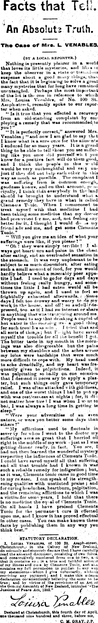 Facts that Tel’. An Absoluts Truth. The Oa.se of* Mrs. L. VENABLES. (by a local reporter.) Nothing is presently pla lifer in a world that loves it* little inysteriew, and lik< u io keep the observer in a Mate o' ti suspense aboat a good m uiy things, than the fact that it is beginning to solve a great many mysteries that for long have remained *unrntangled. Perhaps the most important of the lot is thr one in reference to which Mrs. Louisa Venables, of No. 100 St. Asaph-strwt, recently spoke to our reporter when asked. “ Is it true that you effected a recovery from an old-standing complaint by employing a remedy that was recommended to you ? ” “It is perfectly correct,” answered Mrs. Venables ; “ami now I am glad to say thrt I know what is a sure cure for the aihm-nts I endured for so many years. It is a gre»nd thing to be able to tell ‘hose you see sutiering like you once did yourself wh t you know for a positive fact will do them good, and I think the people in thia w vid would be very uurboughtful and veiy unjust if the) did not livlp each other in this way as much as possible. The complaint I was suff-jring from is coihmon enough, goodnssK knows, and on that account, nr ucipalJy, I think thtH everybody in th** land should l>e brought to understand what a grand remedy they h»\ve in what is culled elements Tonic. When I commenced to treat royr.e f with that medicine I had been taking some medicine that my doctor had prescribed f- r me, and, not feeling any better for it, I thought I would d-- .a my friend adv sod me, and get some Clenmrita Tonic. ” “ Will you give me an idea of whut your sufferings were like, if you please ’ ” “Oh ’ they were simply terrible ’. I always got heart- urn and pains in the chest after eating, end an overloaded sensation in the stomach. It was very unpleasant to be subject to se much discomfort, after eating such a small amount of food, for you would hardly believe what a miserably poor appetite I had. I used to go for days and days without feeling really hungry, and sometimes the little I had eaten would all be thrown up again, and I used to feel so frightfully exhausted afterwards. Some days I felt too drowsy and weary to do my work in th* house, and off! so awfully?depressed, too as if I had no interest or share in anything that was t ra’.s-nj iug around me People used to say that drinking a cupful of hot water in tlm mor ui’g -.rn - a good thing for such trend l«s min . 1 tried that and all sorts of things; but I* • ight have saved mysfclf the trouble for all the benefit I got. The bitter taite in my mouth in the mornings was also disagreeable but the pains between my shoulders and the aches across my loins were hardships that were much more difficult to cope with. My head used to ache dreadfully, and my heart was frequently given to palpitations. Indeed, it. was palpitating mo badly on one occasion that I deemed it neces ary to apply a plaster, but such things only gave temporary relief. I was often attacked v-ith giddiness, and one of the worst things I had to put up with was restlessness at nights ; for, it di : not matter how tire I I was when I w- nr to bed, I was always a long time in getting to sleep. ” “ Were your adversities of au even nature, or were you better some days than others ?” “My afflictions used to fluctuate in sever ty for when I went to the doctor my sufferings a ore so great that I hurried off right in the middle of my work just as I was getting dinner ready, in fact. You see, I had not then learned the wonderful mystery respecting the influences of Clements Tonic. I could Lave saved myself all that suffering and all that trouble had I known it was such a reliable remedy for indigestion ; but, as it was, Clements tonic came in good time to my release. I can speak of its strengthening qualities with unstinted praise ; and for curing headaches, heartburn, palpitation, and the remaining afflictions to which I was a victim for some years, I hold that there is no mediejne the eq al of Clements Tonic. On all hands I have praised Clements Tonic for the per mane't cure it effected upon me, and I z know it has proved effectual in other cases. You can make known these facts by publishing them in any way you think best.” STATUTORY DECLARATION. J, Louisa Venablss, of 100 St. Assph-Ktreet. Christchurch,’ in the Cslony of New Zealand, do .solemnly and sincere!) declare that I have carefully read the annexed document, consisting’ of two folios, and consecutively numbered from one to two, a d that it contains »» ; is a true and faithful account of my illness and ciue by Clements Tonic, and ai„o contains my full permission to publish in any way my statements—-which I give voluntarily, wiihnui receiving any payment; and I make this s »lemn declaration conscientiously believing the same to be true; and by virtue of the provisions of an Act of the General Assembly of New Zealand, intituled * •The Justices of Peace Act, 1882.” f Declared at Christchurch, this fourth day of April, •ne thousand nine hundred and three, before me, C. M. GRAY, J.P.