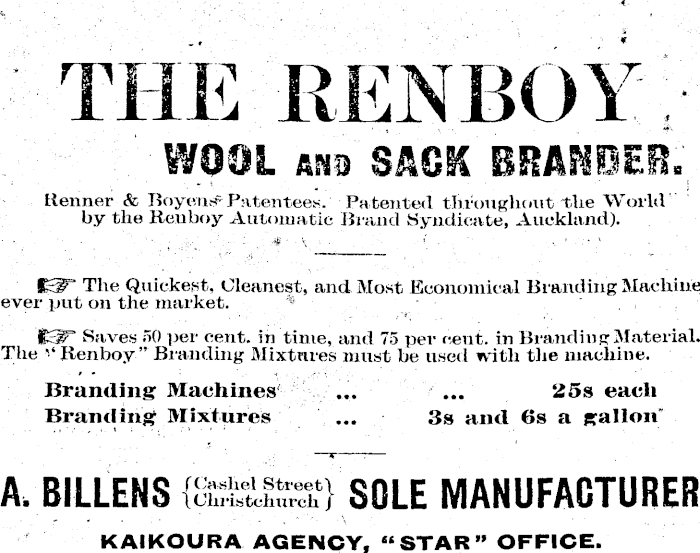 THE RENBOY WOOL ano SACK BRANDED. Renner & Boyens Patentees. Patented throughout the World by the Renboy Automatic Bi and Syndicate, Auckland). KF" The Quickest, Cleanest, and Most Economical Branding Machine ever put on the market. K3F Saves 50 per cent, in time, and 75 per cent, in Branding Material. The ■‘Renboy” Branding Mixtures must be used with the machine. Branding Machines ... ... 25s each Branding Mixtures ... 3s and 6s a gallon A. BILLENS \ Christchurch J SOLE MANUFACTURER KAIKOURA AGENCY, “STAR” OFFICE.