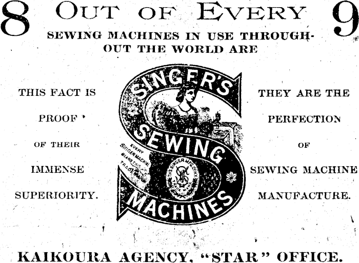 8 Out of Every Q SEWING MACHINES IN USE THROUGHOUT THE WORLD ARE THIS FACT IS THEY ARE THE On PROOF ~ PERFECTION OF THEIR OF IMMENSE SEWING MACHINB SUPERIORITY. MANUFACTURE. KAIKOURA AGENCY, “STAR” OFFICE.