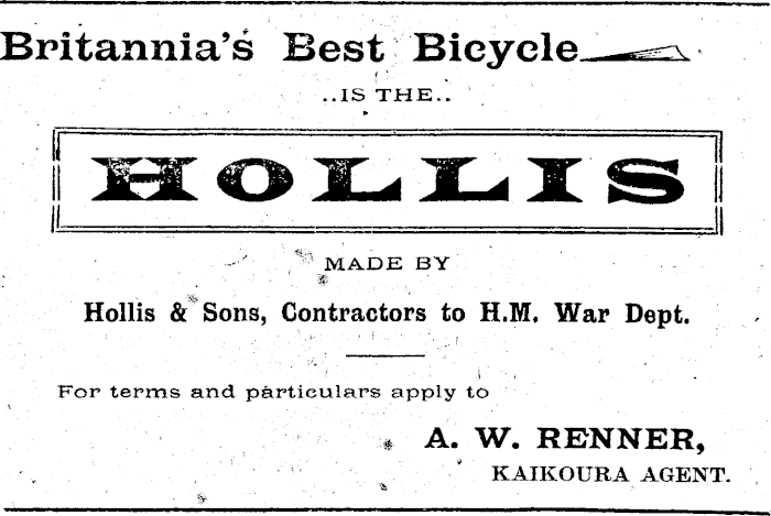 Britannia’s Best Bicycle ..IS THE.. ihoxxis! II __ II MADE BY Hollis & Sons, Contractors to H.M. War Dept. For terms and particulars apply to A. W. RENNER, KAIKOURA AGENT.