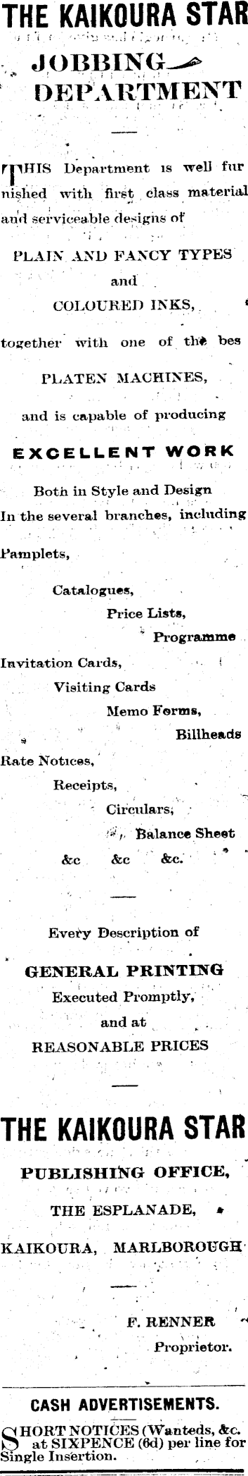 THE KAIKOURA STAR DEPARTMENT rjTHIS Department is well fur nished with first class material and serviceable designs of PLAIN AND FANCY TYPES and COLOURED INKS, together with one of thfc bes PLATEN MACHINES, and is capable of producing EXCELLENT WORK Both in Style and Design In the several branches, including Pamplets, Catalogues, Price Lists, Programme Invitation Cards, Visiting Cards Memo Forms, Billheads Rate Notices, Receipts, Circulars, •' Balance Sheet &c &c &c. Every Description of GENERAL. PRINTING Executed Promptly, and at REASONABLE PRICES THE KAIKOURA STAR PUBLISHING office, THE ESPLANADE, KAIKOURA, MARLBOROUGH F. RENNER Proprietor. CASH ADVERTISEMENTS. SHORT NOTICES (Wanteds, &c. at SIXPENCE (fid) per line for Single Ins'ertion.