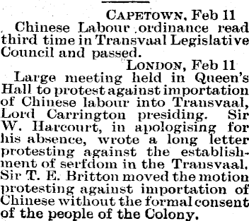 Capetown, Feb 11 Chinese Labour .ordinance read third time in Transvaal Legislative Council and passed. London, Feb 11 Large meeting held in Queen’s Hall to protest against importation of Chinese labour into Transvaal, Lord Carrington presiding. Sir W. Harcourt, in apologising for his absence, wrote a long letter protesting against the establishment of serfdom in the Transvaal. Sir T. E. Britton moved the motion protesting against importation of Chinese without the formal consent of the people of the Colony.