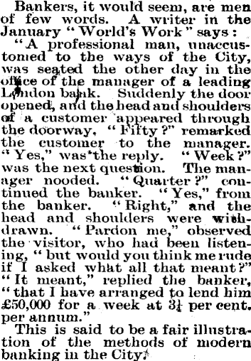 Bankers, it would seem, are men of few words. A writer in the January “ World’s Work ” says : “A professional man, unaccustomed to the ways of the City, was seated the other day in the office of the manager of a leading London balnk. Suddenly the door opened, and the head and shoulders of a customer appeared through the doorway. “ Fifty ?” remarked the customer to the manager. “Yes,” was*tne reply. “Week?” was the next question. The manager nooded. “ Quarter ?” continued the banker. “Yes,” from the banker. “ Right,” and the head and shoulders were withdrawn. _ “Pardon me,” observed the visitor, who had been listening, “ but would you think me rude if I asked whkt all that meant?” “ It meant,” replied the banker, “ that I have arranged to lend him £50,000 for a week at 3| per cent, per annum.” This is said to be a fair illustration of the methods of modern banking in the City.