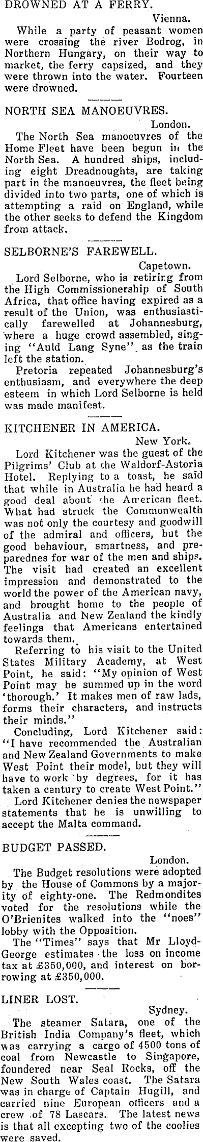 DROWNED AT A FERRY. Vienna. While a party of peasant women were crossing the river Bodrog, in Northern Hungary, on their way to market, the ferry capsized, and they were thrown into the water. Fourteen were drowned. NORTH SEA MANOEUVRES. London. The North Sea manoeuvres of the Home Fleet have been begun in the North Sea. A hundred ships, including eight Dreadnoughts, are taking part in the manoeuvres, the fleet being divided into two parts, one of which is attempting a raid on England, while the other seeks to defend the Kingdom from attack. SELBORNE'S FAREWELL. Capetown. Lord Selborne, who is retiring from the High Commissionership of South Africa, that office having expired as a result of the Union, was enthusiastically farewelled at Johannesburg, where a huge crowd assembled, singing "Auld Lang Syne", as the train left the station. Pretoria repeated Johannesburg's enthusiasm, and everywhere the deep esteem in which Lord Selborne is held was made manifest. KITCHENER IN AMERICA. New York. Lord Kitchener was the guest of the Pilgrims' Club at che Waldorf-Astoria Hotel. Replying to a toast, he said that while in Australia he had heard a good deal about" '.he Airerican fleet. What had struck the Commonwealth was not only the courtesy and goodwill of the admiral and officers, but the good behaviour, smartness, and preparednes for war of the men and ship?. The visit had created an excellent impression and demonstrated to the world the power of the American navy, and brought home to the people of Australia and New Zealand the kindly feelings that Americans entertained towards them % Referring to his visit to the United States Military Academy, at West Point, he said: "My opinion of West Point may be summed up in the word 'thorough.' It makes men of raw lads, forms their characters, and instructs their minds." Concluding, Lord Kitchener said: "I have recommended the Australian and New Zealand Governments to make West Point their model, but they will have to work by degrees, for it has taken a century to create West Point." Lord Kitchener denies the newspaper statements that he is unwilling to accept the Malta command. BUDGET PASSED. London. The Budget resolutions were adopted by the House of Commons by a majority of eighty-one. The Redmondites voted for the resolutions while the O'Brienites walked into the "noes" lobby with the Opposition. The "Times" says that Mr LloydGeorge estimates the loss on income tax at £350,000, and interest on borrowing at £350,000. LINER LOST. Sydney. The steamer Satara, one of the British India Company's fleet, which was carrying a cargo of 4500 tons of coal from Newcastle to Singapore, foundered near Seal Rocks, off the New South Wales coast. The Satara was in charge of Captain Hugill, and carried nine European officers and a crew of 78 Lascars. The latest news is that all excepting two of the coolies were saved.