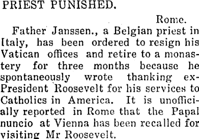 PRIEST PUNISHED. Rome. Father Janssen., a Belgian priest in Italy, has been ordered to resign his Vatican offices and retire to a monastery for three months because he spontaneously wrote thanking exPresident Roosevelt for his services to Catholics in America. It is unofficially reported in Rome that the Papal nuncio at Vienna has been recalled for visiting Mr Roosevelt.