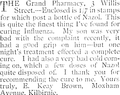 mHE Grand Pharmacy, 3 Willis Street. —Enclosed is 1/7 in stamps for which post a bottle of Nazol. This is quite the finest thing I've found for curing Influenza. My son was very bad with the complaint recently, it had a good grip on him —but one night's treatment effected a complete cure. I had also a very bad cold coming on, which a few doses of Nazol quite disposed of. I thank you for recommending the cure to me. Yours truly, E. Keay Brown, Moxham Avenue, Kilbirnie.