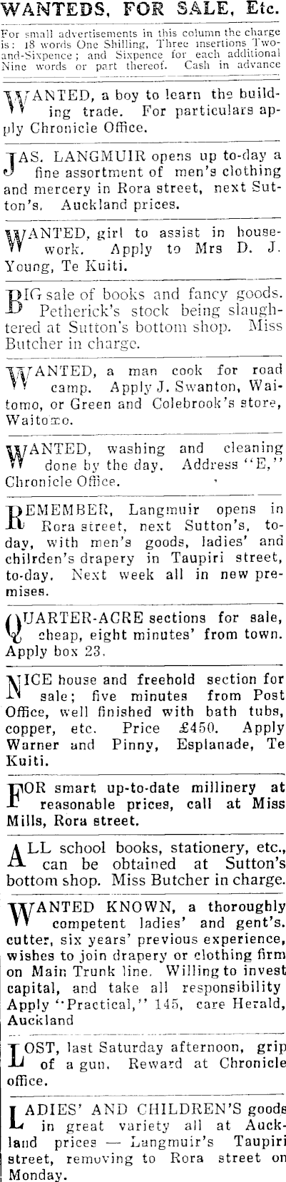 WANTEDS, FOR SALE, Etc. For small advertisements in this column the charge is: 18 words One Shilling, Three insertions 1 wo-and-Sixpence; and Sixpence for each additional Nine words or part thereot. Cash in advance /"ANTED, a boy to learn the building trade. For particulars apply Chronicle Office. J AS. LANGMUIR opens up to-day a fine assortment of men's clothing and mercery in Rora street, next Sutton's. Auckland prices. WANTED, girl to as3ist in housework. Apply to Mrs D. J. Young, Te Kuiti. BIG sale of books and fancy goods. Petherick's stock being slaughtered at Sutton's bottom shop. Miss Butcher in charge. "|/»/ T ANTED, a man cook for road ' • camp. Apply J. Swanton, Waitomo, or Green and Colebrook's store, Waitorro. WANTED, washing and cleaning done by the day. Address "E," Chronicle Office. REMEMBER, Langmuir opens in Rora street, next Sutton's, today, with men's goods, ladies' and chilrden's drapery in Taupiri street, to-day. Next week all in new premises. QUARTER-ACRE sections for sale, cheap, eight minutes' from town. Apply box 23. ICE house and freehold section for sale; five minutes from Post Office, well finished with bath tubs, copper, etc. Price £4tso. Apply Warner and Pinny, Esplanade, Te Kuiti. FOR smart up-to-date millinery at reasonable prices, call at Miss Mills, Rora street. ALL school books, stationery, etc., can be obtained at Sutton's bottom shop. Miss Butcher in charge. WANTED KNOWN, a thoroughly competent ladies' and gent's, cutter, six years' previous experience, wishes to join drapery or clothing firm on Main Trunk line. Willing to invest capital, and take all responsibility Apply '"Practical," 145, care Herald, Auckland LOST, last Saturday afternoon, grip of a gun. Reward at Chronicle office. LADIES' AND CHILDREN'S goods in great variety all at Auckland prices Langmuir's Taupiri street, removing to Rora street on Monday.