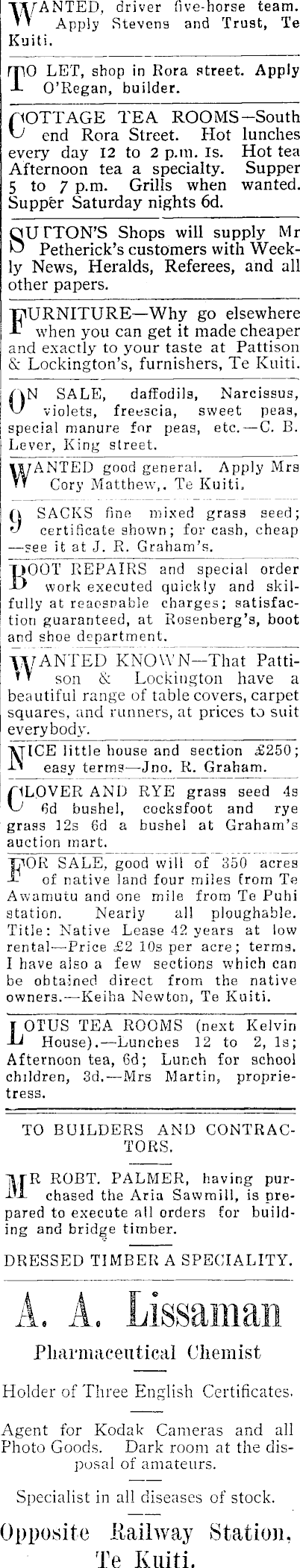 TVTANTED, driver five-horse team. ' < Apply Stevens and Trust, Te Kaiti. TO LET, shop in Rora street. Apply O'Regan, builder. riOTTAGE TEA ROOMS-South end Rora Street. Hot lunches every day 12 to 2 p.m. is. Hot tea Afternoon tea a specialty. Supper 5 to 7 p.m. Grills when wanted. Supper Saturday nights 6d. SUTTON'S Shops will supply Mr Petherick's customers with Weekly News, Heralds, Referees, and all other papers. FURNITURE —Why go elsewhere when you can get it made cheaper and exactly to your taste at Pattison & Lockington's, furnishers, Te Kuiti. ON SALE, daffodils, Narcissus, violets, freescia, sweet peas, special manure for peas, etc. —C. B. Lever, King street. WANTED good general. Apply Mrs Cory Matthew,. Te Kuiti, 9 SACKS fine mixed grass seed; certificate shown; for cash, cheap see it at J. R. Graham's. BOOT REPAIRS and special order work executed quickly and skilfully at reaosnable charges; satisfaction guaranteed, at Rosenberg's, boot and shoe department. WAXTKI) KNOWN—That Patti- ' » son & Lockiugton have a beautiful range of table covers, carpet squares, and runners, at prices to suit everybody. MICE little house and section £250; -L' easy terms —Jno. R. Graham. /"ILOVER AND RYE grass seed 4s 6d bushel, cocksfoot and rye grass 12s Sd a bushel at Graham's auction mart. TjiOß SALE, good wiTl of 350 acres J- of native land four miles from Te Awamutu and one mile from Te Puhi station. Nearly all ploughable. Title: Native Lease 42 years at low rental—Price £2 10s per acre; terms. I have also a few sections which can be obtained direct from the native owners. —Keiha Newton, Te Kuiti. T OTUS TEA ROOMS (next Kelvin House). —Lunches 12 to 2, Is; Afternoon tea, 6d; Lunch for school children, 3d,—Mrs Martin, proprietress. TO BUILDERS AND CONTRACTORS. MR ROBT. PALMER, having purchased the Aria Sawmill, is prepared to execute all orders for building and bridge timber. DRESSED TIMBER A SPECIALITY. A. A. Lissaman Pharmaceutical Chemist Holder of Three English Certificates. Agent for Kodak Cameras and all Photo Goods. Dark room at the disposal of amateurs. Specialist in all diseases of stock. Opposite .Railway Station, Te Kuiti.