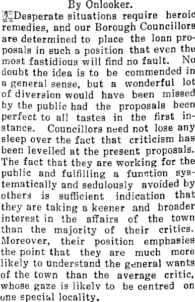 By Onlooker. situations require heroic remedies, and our Borough Councillors are determined to place the loan proposals in such a position that even the most fastidious will find no fault. No doubt the idea is to be commended in a general sense, but a wonderful lot of diversion would have been missed by the public had the proposals been perfect to ail tastes in the first instance. Councillors need not lose any sleep over the fact that criticism has been levelled at the present proposals. The fact that they are working for the public and fulfilling a function systematically and sedulously avoided by others is sufficient indication that they are taking a keener and broader interest in the affairs of the town than the majority of their critics. Moreover, their position emphasies the point that they are much more likely to understand the general wants of the town than the average critic, whose gaze is likely to be centred on one special locality.