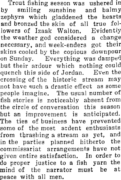 Trout fishing season was ushered in by smiling sunshine and balmy zephyrs which gladdened the hearts and bronzed the skin of all true followers of Izaak Walton. Evidently the weather god considered a change necessary, and week-enders got their skins cooled by the copious downpour on Sunday. Everything was damped but their ardour which nothing could quench this side of Jordan. Even the crossing of the historic stream may not have quch a drastic effect as some people imagine. The usual number of fish stories is noticeably absent from the circle of conversation this season but an improvement is anticipated. The ties of business have prevented some of the most ardent enthusiasts from thrashing a stream as yet, and in the parties planned hitherto the commissariat arrangements have not given entire satisfaction. In order to do proper justice to a fish yarn the mind of the narrator must be at peace with all men.