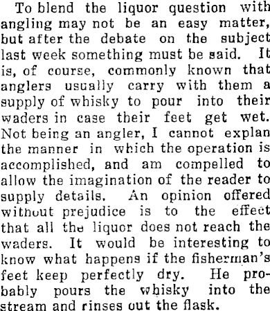 To blend the liquor question with angling may not be an easy matter, but after the debate on the subject last week something must be said. It is, of course, commonly known that anglers usually carry with them a supply of whisky to pour into their waders in case their feet get wet. Not being an angler, I cannot explan the manner in which the operation is accomplished, and am compelled to allow the imagination of the reader to supply details. An opinion offered witnuut prejudice is to the effect that all the liquor does not reach the waders. It would be interesting to know what happens if the fisherman's feet keep perfectly dry. He probably pours the whisky into the stream and rinses out the flask.