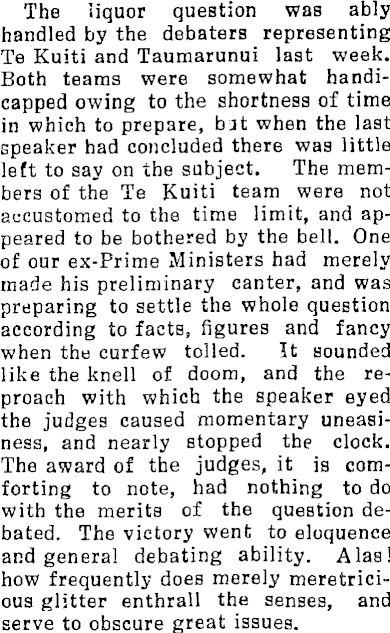 The liquor question was ably handled by the debaters representing Te Kuiti and Taumarunui last week. Both teams were somewhat handicapped owing to the shortness of time in which to prepare, bjt when the last speaker had concluded there was little left to say on the subject. The members of the Te Kuiti team were not accustomed to the time limit, and appeared to be bothered by the bell. One of our ex-Prime Ministers had merely made his preliminary canter, and was preparing to settle the whole question according to facts, figures and fancy when the curfew tolled. It sounded like the knell of doom, and the reproach with which the speaker eyed the judges caused momentary uneasiness, and nearly stopped the clock. The award of the judges, it is comforting to note, had nothing to do with the merits of the question debated. The victory went to eloquence and general debating ability. Alas! how frequently does merely meretricious glitter enthrall the senses, and serve to obscure great issues.
