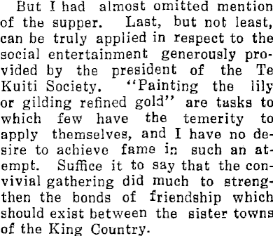 But I had almost omitted mention of the supper. Last, but not least, can be truly applied in respect to the social entertainment generously provided by the president of the Te Kuiti Society. "Painting the lily or gilding refined gold" are tasks to which few have the temerity to apply themselves, and I have no desire to achieve fame in such ah atempt. Suffice it to say that the convivial gathering did much to strengthen the bonds of friendship which should exist between the sister towns of the King Country.