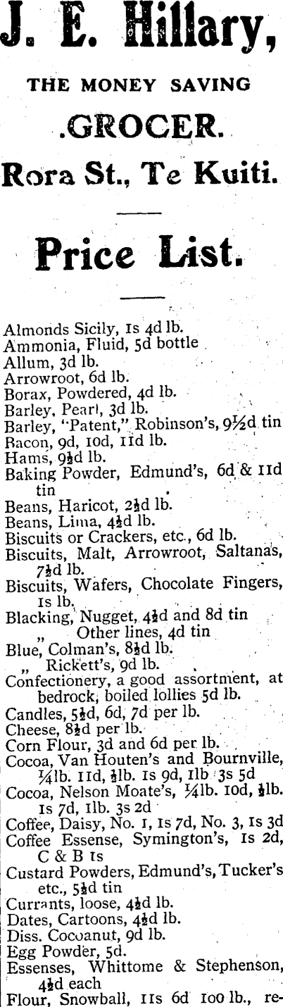 lE. Hillary, THE MONEY SAVING Rora St., Te Kuiti. Price List Almonds Sicily, Is4dlb. Ammonia, Fluid, 5 d bottle Allum, 3d lb. Arrowroot, 6d lb. Borax, Powdered, 4d lb. Barley, Pearl, 3d lb. yj Barley,'"Patent," Robinson's, 9*£ d tin Bacon, 9d, iod, lid lb. Hams', 9id lb. Baking Powder, Edmund's, od&Hd tin . . ■.'' Beans, Haricot, 2jd lb. Beans, Lima, 4id lb. \ . Biscuits or Crackers, etc., 6d lb. . - Biscuits, Malt, Arrowroot, Saltanas, 7id lb. Biscuits, Wafers, Chocolate Fingers, is lb. , Blacking, Nugget, 4id and 8d tin . Other lines, 4d tin Blue, Colman's, BJd lb. „ Rick'ett's, 9d lb. ■■' . . Confectionery, a good assortment, at bedrock; boiled lollies $d lb. „ Candles, sid, 6d, 7d per lb. Cheese, BJd per lb. Corn Flour, 3d and 6d per lb. . Cocoa, Van Houten's and Bournville, %lb. iidjlb. is9d, ilb'3ssd Cocoa, Nelson Moate's, J4lb. iod, lib. is 7d, lib. 3s 2d Coffee, Daisy, No. I, is 7d, No. 3, is 3d Coffee Essense, Symington's, is 2d, C & B is Custard Powders, Edmund's, Tucker's etc., sld tin Currants, loose, 4ld lb. Dates, Cartoons, 4id lb. Diss. Cocoanut, 9d lb. Egg Powder, sd. Essenses, Whittome & Stephenson, 4id each Flour, Snowball, Us 6d loolb., re-