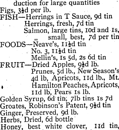 duction for large quantities Figs, 3id Per lb. FlSH—Herrings in T Sauce, 9d tin Herrings, fresh, 76. tin Salmon, large tins, lOd and is, „ small, best, 7d per tin FOODS—Neave's, I lid tin , No. 3, Hid tin Mellin's, Is sd, 2s 6d tin FRUlT—Dried Apples, 9id lb. Prunes, 5d lb., New Season's 4d lb, Apricots, lid lb., Mt. » HamiltoaPeaches, Apricots, lid lb, Pears is lb. Golden Syrup, 6d tin; 7lb tins Is 7d Groates, Robinson's Patent, 9id tin Ginger, Preserved, 9d lb. Herbs, Dried, 6d bottle Honey, best white clover, lid tin,