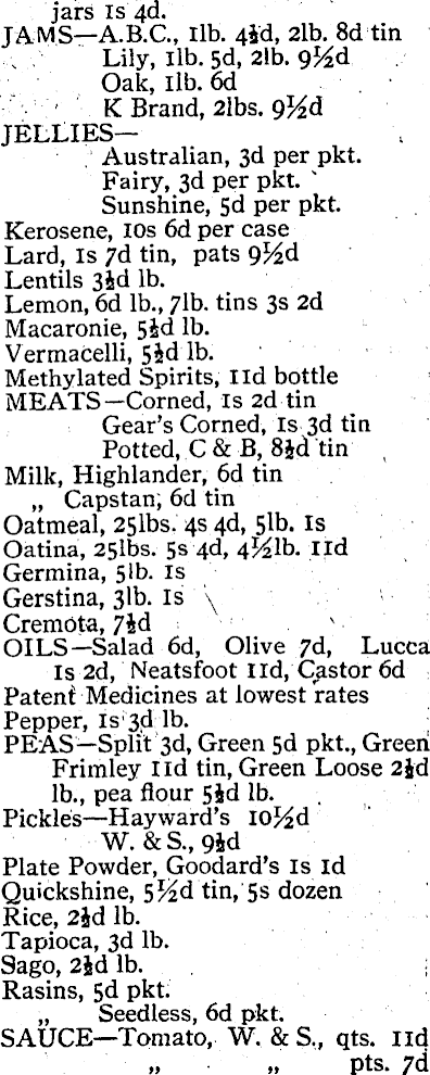 jars is 4a. JAMS—A.B.C., lib. 4id, 2lb. 8d tin Lily, lib. sd, 2lb. ;■ Oak, lib. 6d ■"■■'■:• K Brand, 2lbs. 9 x Ad JELLIES— Australian, 3d per pkt. Fairy, 3d per pkt. s Sunshine, 5d per pkt. Kerosene, 10s 6d per case Lard, Is 76. tin, pats 9 l Ad Lentils 3id lb. Lemon, 6d lb., 7lb. tins 3s 2d Macaronie, sid lb. Vermacelli, sid lb. Methylated Spirits, lid bottle MEATS—Corned, Is 2d tin Gear's Corned, Is 3d tin Potted, C&B,Bjd tin , Milk, Highlander, 6d tin „ Capstan; 6d tin Oatmeal, 25lbs. 4s 4d, slb. Is Oatina, 25lbs. 5s 4d, 4%1b. lid Germina, 51b. is Gerstina, 3lb. Is \ Cremota, 7fcd v OlLS—Salad 6d, Olive 7d, Lucca Is 2d, Neatsfoot lid, Castor 6d Patent Medicines at lowest rates Pepper, ls ; 3dlb. PEAS—Split 3d, Green 5d pkt., Green Frimley lid tin, Green Loose 2jd lb., pea flour sid lb. Pickles —Hayward's io^d W. &S.,9Jd Plate Powder, Goodard's Is id Quickshine, tin, 5s dozen Rice, 2jdlb. Tapioca, 3d lb. Sago, 2jdlb. . Rasins, 5d pkt. „ Seedless, 6d pkt. SAUCE—Tomato, W. & S., qts. lid » » pts. 7&