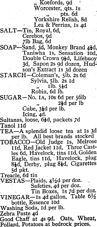 „ Koefords, 9d i Worcester,,qts. is „ pts. 6d Yorkshire Relish, 8d Lea & Perrins, is 4d SALT—Tin, Royal, 6d, Cerebos, gd , 7lbßag, 6d SOAP—Sand, 3d, Monkey Brand 4Jd, Taniwha Is, Sensation iod, Double Crown gjd, Lifebuoy 3d, Sapon 2s 9d dozen, Hudson's Extract is 3d dozen STARCH—Coleman's, slb. 2s 6d Sylvia, slb. 2s id „ Hb. 5Jd Robin, 6d lb. SUGAR—No. ia, 10s 6d per 561b „ 2jd per lb Cube, 3id per lb. Icing, 4d. Sultanas, loose, 6jd, packets 76. Tariol lid TEA—A splendid loose tea at Is 3d per lb. All best brands stocked TOBACCO—OId Judge is, Melrose I id, Red Jacket lid, Three Castles 6d, HaVelock, tins lid, Golden Eagle, tins I Id, Havelock, plug Bjd, Derby, plug Bid, Cigarettes 5d pkt. Treacle, 6d tin VESTAS—PIaids, 4%d per doz. , Safeties, 4d per doz. Tin Boxes, Is /d per doz. VINEGAR—is 4d gallon, Table bVi bottle, Essence iod Washing Soda, id per lb. Zebra Paste 4d Good Chaff at 4s 9d- Oats, Wheat, Pollard, Potatoes at bedrock prices*