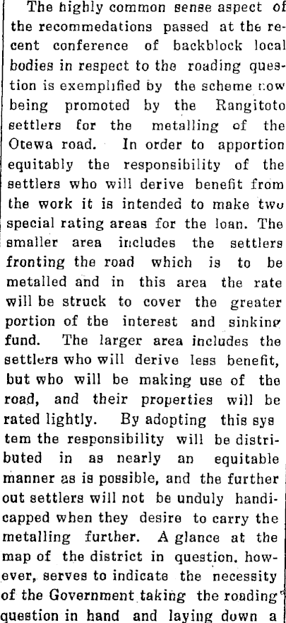 The highly common sense aspect of the recommedations passed at the recent conference of backblock local bodies in respect to the roading question is exemplified by the scheme r.ow being promoted by the Rangitoto settlers for the metalling of the Otewa road. In order to apportion equitably the responsibility of the settlers who will derive benefit from the work it is intended to make two special rating areas for the loan. The smaller area includes the settlers fronting the road which is to be metalled and in this area the rate will be struck to cover the greater portion of the interest and sinkinp fund. The larger area includes the settlers who will derive less benefit, but who will be making use of the road, and their properties will be rated lightly. By adopting this sys tem the responsibility will be distributed in as nearly an equitable manner as is possible, and the further out settlers will not be unduly handicapped when they desire to carry the metalling further. A glance at the map of the district in question, however, serves to indicate the necessity of the Government taking the roading' question in hand and laying down a