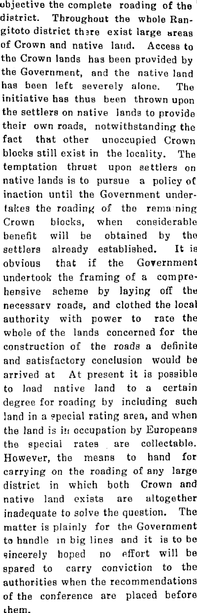 objective the complete roading of the district. Throughout the whole Rangitoto district thare exist large ureas of Crown and native land. Access to the Crown lands has been provided by the Government, and the native land has been left severely alone. The initiative has thus been thrown upon the settlers on native lands to provide their own roads, notwithstanding the fact that other unoccupied Crown blocks still exist in the locality. The temptation thrust upon settlers on native lands is to pursue a policy of inaction until the Government undertakes the roading of the remaning Crown blocks, when considerable benefit will be obtained by the settlers already established. It is obvious that if the Government undertook the framing of a comprehensive scheme by laying off the necessary roads, and clothed the local authority with power to rate the whole of the lands concerned for the construction of the roads a definite and satisfactory conclusion would be arrived at At present it is possible to load native land to a certain degree for roading by including such land in a special rating area, and when the land is in occupation by Europeans the special rates are collectable. However, the means to hand for carrying on the roading of any large district in which both Crown and native land exists are altogether inadequate to solve the question. The matter is plainly for the Government to handle in big lines and it is to be sincerely hoped no effort will be spared to carry conviction to the authorities when the recommendations of the conference are placed before ihem.