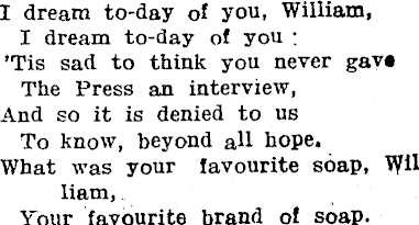 I dream to-day of you, William, I dream to-day of you ; 'Tis sad to think you never gav« The Press an interview, And so it is denied to us To know, beyond all hope. What was your favourite soap, William, Tour favourite brand of soap.