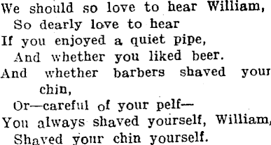 We should so love to hear William, So dearly love to hear If you enjoyed a quiet pipe, And whether you liked beer. And whether barbers shaved youi chin, Or—careful of your pelf— You always shaved yourself, William, Shaved your chin yourself.