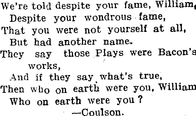 We're told despite your fame, William, Despite your wondrous fame, That you were not yourself at all, But had another name. They say those Plays were Bacon's works, And if they say what's true, Then who on earth were you, William Who on earth were you? —Coulson.