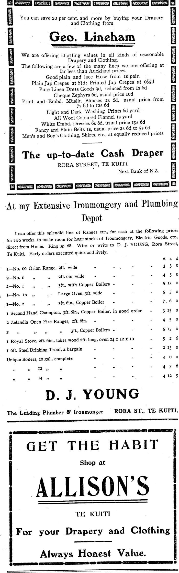 HI You can save 20 per cent, and more by buying your Drapery || H and Clothing from m 1 Geo. Lineham 1 I We are offering startling values in all kinds of seasonable Drapery and Clothing. The following are a few of the many lines we are offering at far less than Auckland prices. Good plain and lace Hose from is pair. Plain Jap Crepes at 6id; Printed Jap Crepes at 9^d Pure Linen Dress Goods 9d, reduced from Is 6d Cheque Zephyrs 6d, usual price iod Print and Embd. Muslin Blouses 2s 6d, usual price from 7s 6d to I2s 6d Light and Dark Washing Prints 6d yard All Wool Coloured Flannel Is yard White Embd. Dresses 6s 6d, usual price 19s 6d Fancy and Plain Belts is, usual price 2s 6d to 5s 6d Men's and Boy's Clothing, Shirts, etc., at equally reduced prices The up-to-date Cash Draper RORA STREET, TE KUITI. Next Bank of N.Z. I ■At my Extensive Ironmongery and Plumbing Depot I can offer this splendid line of Ranges etc., for cash at the following prices for two weeks, to make room for huge stocks of Ironmongery, Electric Goods, etc., direct from Home. Ring up 68. Wire or write to D. J. YOUNG, Rora Street, TeKuiti. Early orders executed quick and lively. £ s d I—No. 00 Orion Range, 2ft. wide - - . - " 3 5 2—No. 0 „ » 2ft 6in wide - - - - 45 0 2-No. 1 „ » 3ft., with Copper Boilers - - 513 0 i-No. IA „ „ Large Oven, 3ft. wide - - " - 55 0 .I—No. 2 „ „ 3ft. 6in., Copper Boiler - - - 7.6 0 i Second Hand Champion, 3ft. fin., Copper Boiler, in good order - 315 0 2 Zelandia Open Fire Ranges, 2ft 6in. - - - - 45 0 2 „ „ ~ ~ 3ft, Copper Boilers - - - 515 0 I Royal Stove, 2ft 6in., takes wood 2ft long, oven 24 xl2x 10 - 526 _ a*, ci 1 TVrmf a harirain - - - " 2 15 0 I—No. 00 Orion Range, 2ft wide - - . 2—No. 0 „ » 2ft 6in wide 2-No. 1 » » 3ft., with Copper Boilers - i—No. IA „ „ Large Oven, 3ft wide .I—No. 2 „ „ 3ft. 6in., Copper Boiler - i Second Hand Champion, 3ft. 6in., Copper Boiler, in good order 2 Zelandia Open Fire Ranges, 2ft 6in. - 2 „ „ „ » 3ft, Copper Boilers - I Royal Stove, 2ft 6in., takes wood 2ft long, oven 24 x 12 x 10 I 6ft Steel Drinking Trouf, a bargain - - - Unique Boilers, 10 gal., complete - 476 D. J. YOUNG The Leading Plumber 6? Ironmonger RORA ST., TE KUITI. GET THE HABIT Shop at ALLISONS TE KUITI For your Drapery and Clothing Always Honest Value.