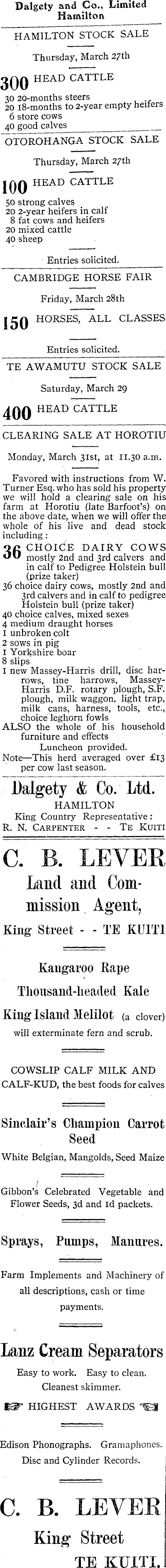 Dalgcty and Co., Limited Hamilton HAMILTON STOCK SALE Thursday, March 27th >f\ri HEAD CATTLE 30 20-months steers 20 18-months to 2-year empty heirers 6 store cows 40 good calves _____ OTOROHANGA STOCK SALE Thursday, March 27th JAQ HEAD CATTLE 50 strong calves 20 2-year heifers in calf 8 fat cows and heifers 20 mixed cattle 40 sheep Entries solicited. CAMBRIDGE HORSE FAIR Friday, March 28th lEft HORSES, ALL CLASSES Entries solicited. TE AWAMUTU STOCK SALE Saturday, March 29 400 HEAD CATTLE Monday, March 31st, at 11.30 a.m. Favored with instructions from W. Turner Esq. who has sold his property we will hold a clearing sale on his farm at Horotiu (late Barfoot's) on the above date, when we will offer the whole of his live and dead stock including : 9C CHOICE DAIRY COWS "U mostly 2nd and 3rd calvers and in calf to Pedigree Holstein bull (prize taker) 36 choice dairy cows, mostly 2nd and 3rd calvers and in calf to pedigree Holstein bull (prize taker) 40 choice calves, mixed sexes 4 medium draught horses 1 unbroken colt 2 sows in pig I Yorkshire boar 8 slips I new Massey-Harris drill, disc harrows, tine harrows, MasseyHarris D.F. rotary plough, S.F. plough, milk waggon, light trap, milk cans, harness, tools, etc., choice leghorn fowls ALSO the whole of his household furniture and effects Luncheon provided. Note —This herd averaged over £l3 per cow last season. Dalgety & Co. Ltd. HAMILTON King Country Representative: R. N. Carpenter - - Te Kuiti Land and Commission Agent, King Street - - TE KUITI Kangaroo Kape Thousand-headed Kale King Island Melilot ( a clover) will exterminate fern and scrub. COWSLIP CALF MILK AND CALF-KUD, the best foods for calves Sinclair's Champion Carrot Seed White Belgian, Mangolds, Seed Maize Gibbon's Celebrated Vegetable and Flower Seeds, 3d and id packets. Sprays, Pumps, Manures. Farm Implements and Machinery of all descriptions, cash or time payments. Lanz Cream Separators Easy to work. Easy to clean. Cleanest skimmer. W& HIGHEST AWARDS Edison Phonographs. Gramaphones. Disc and Cylinder Records. TE KUITI.