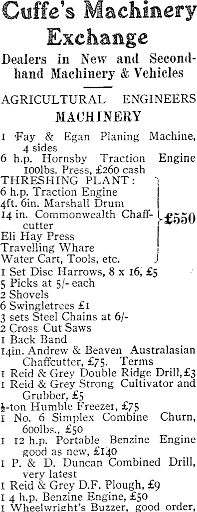 luffe s Machinery Exchange Dealers in New and Secondhand Machinery & Vehicles AGRICULTURAL ENGINEERS MACHINEEY I -Fay & Egan Planing Machine, 4 sides 6 h.p. Hornsby Traction Engine lOOlbs. Press, £260 cash THRESHING PLANT: "} 6 h.p. Traction Engine 4ft. 6in. Marshall Drum j 14 in. Commonwealth Chaff- l-fJKHjA Eli Hay Press Travelling Whare Water Cart, Tools, etc. J 1 Set Disc Harrows, 8 x 16, £5 5 Picks at 5/- each 2 Shovels 6 Swingletrees £1 3 sets Steel Chains at 6/2 Cross Cut Saws I Back Band I4in. Andrew & Beaven Australasian Chaffcutter, £75. Terms I Reid & Grey Double Ridge Drill, £3 I Reid & Grey Strong Cultivator and Grubber, £5 i-ton Humble Freezei, £75 1 No. 6 Simplex Combine Churn, 6001b5., £SO I 12 h.p. Portable Benzine Engine good as new. £l4O I P. & D. Duncan Combined Drill, verv latest I Reid & Grey D.F. Plough, £9 I 4 h.p. Benzine Engine, £SO 1 Wheelwrieht's Buzzer, good order,