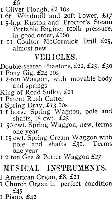 I Oliver Plough, £2 10s I 6ft Windmill and 20ft Tower, £l7 I 5-h.p. Ruston and Proctor's Steam Portable Engine, ioolb pressure, in good order, £l6O I II Coultor McCormick Drill £25, almost new VEHICLES. Double-seated Phaetons, £22, £25, £3O I Pony Gig, £24 10s I 2-ton Waegon, with movable body and springs King of Road Sulky, £2l I Patent Rush Cutter I Spring Dray, £l3 10s I I horse Spring Waggon, pole and shafts, 15 cwt., £25 I 50 cwt. Spring Waggon, new, terms one year 115 cwt. Spring Cream Waggon with pole and shafts £3l. Terms one year I 2 ton Gee & Potter Waggon £27 MUSICAL INSTRUMENTS. I American Organ, £B, £2l I Church Organ in perfect condition £45 I Piano, £42