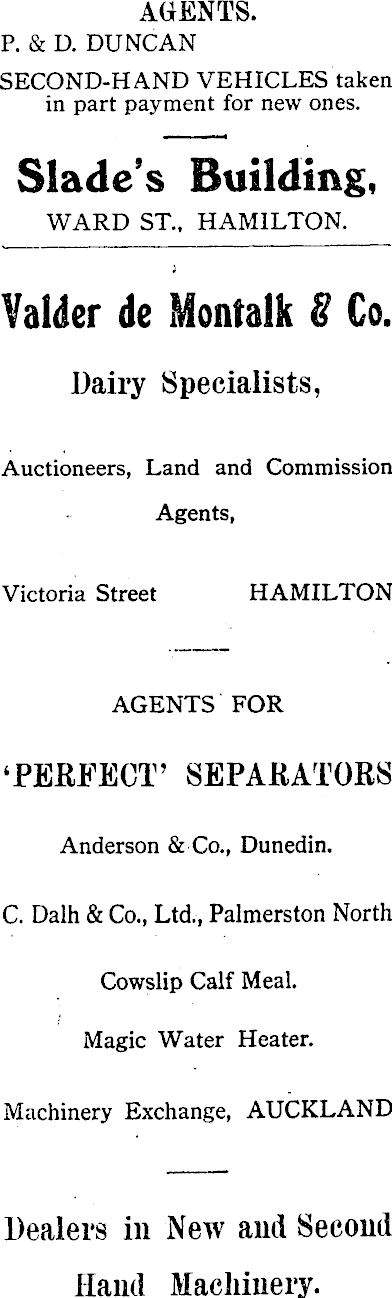 AGENTS. P. & D. DUNCAN SECOND-HAND VEHICLES taken in part payment for new ones. Slade's Building, WARD ST., HAMILTON. Yaider de Montalk 8 Co. Dairy Specialists, Auctioneers, Land and Commission Agents, Victoria Street HAMILTON AGENTS FOR 'PERFECT 1 SEPARATORS Anderson & Co., Dunedin. C. Dalh & Co., Ltd., Palmerston North Cowslip Calf Meal. Magic Water Heater. Machinery Exchange, AUCKLAND Dealers in New and Second Hand Machinery.