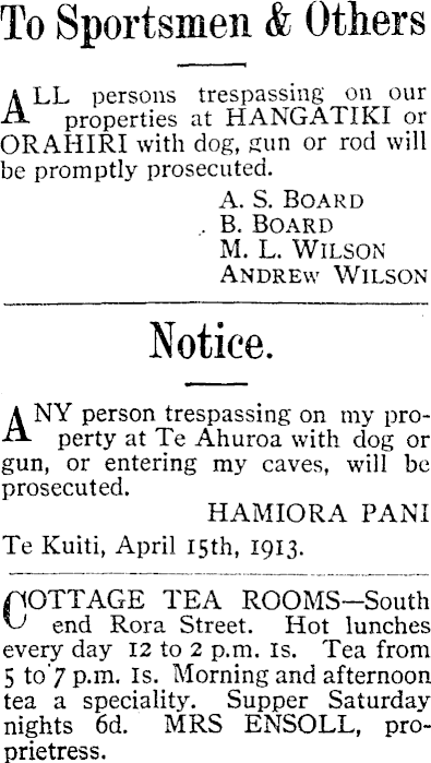 ALL persons trespassing on our properties at HANGATIKI or ORAHIRI with dog, gun or rod will be promptly prosecuted. A. S. Board , B. Board M. L. Wilson Andrew Wilson Notice. 1 NY person trespassing on my pro- - perty at Te Ahuroa with dog or gun, or entering my caves, will be prosecuted. HAMIORA PANI Te Kuiti, April 15th, 1913. pOTTAGE TEA ROOMS-South end Rora Street. Hot lunches every day 12 to 2 p.m. is. Tea from 5 to'7p.m. Is. Morning and afternoon tea a speciality. Supper Saturday nights 6d. MRS ENSOLL, proprietress.