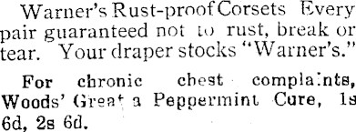 Warner's Rust-proof Corsets Every pair guaranteed not to rust, break or tear. Your draper stocks "Warner's." For chronic cheat complaints, Woods' (ires*; a Peppermint Cure, la 6d, 2s 6d.