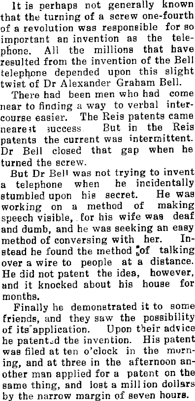 It is perhaps not generally known that the turning of a screw one-fourth of a revolution was responsible for so important an invention as the telephone. AH the millions that have resulted from the invention of the Bell telephone depended upon this slight twist of Dr Alexander Graham Bell. There had been men who had come near to finding a way to verbal intercourse easier. The Reis patents came nearest success But in the Reis patents the current was intermittent. Dr Bell closed that gap when he turned the screw. But Dr BeM was not trying to invent a telephone when he incidentally stumbled upon his secret. He was working on a method of making speech visible, for his wife was deaf and dumb, and he was seeking an easy method of conversing with her. Instead he found the method talking over a wire to people at a distance. He did not patent the idea, however, and it knocked about his house for months. Finally he demonstrated it to some friends, and they saw the possibility of its'application. Upon tbeir advice he patented the invention. His patent was filed at ten o'clock in the murning, and at three in the afternoon another man applied for a patent on the same thing, and lost a million dollars by the narrow margin of seven hourß.