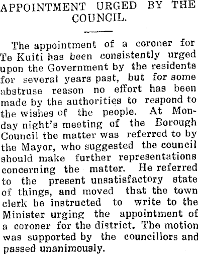 APPOINTMENT URGED BY THE COUNCIL. The appointment of a coroner for Te Kuiti has been consistently urged upon the Government by the residents for several years past, but for some abstruse reason no effort has been made by the authorities to respond to the wishes of the people. At Monday night's meeting of the Borough Council the matter was referred to by the Mayor, who suggested the council should make further representations concerning the matter. He referred to the present unsatisfactory Btate of things, and moved that the town clerk be instructed to write to the Minister urging the appointment of a coroner for the district. The motion was supported by the councillors and passed unanimously.