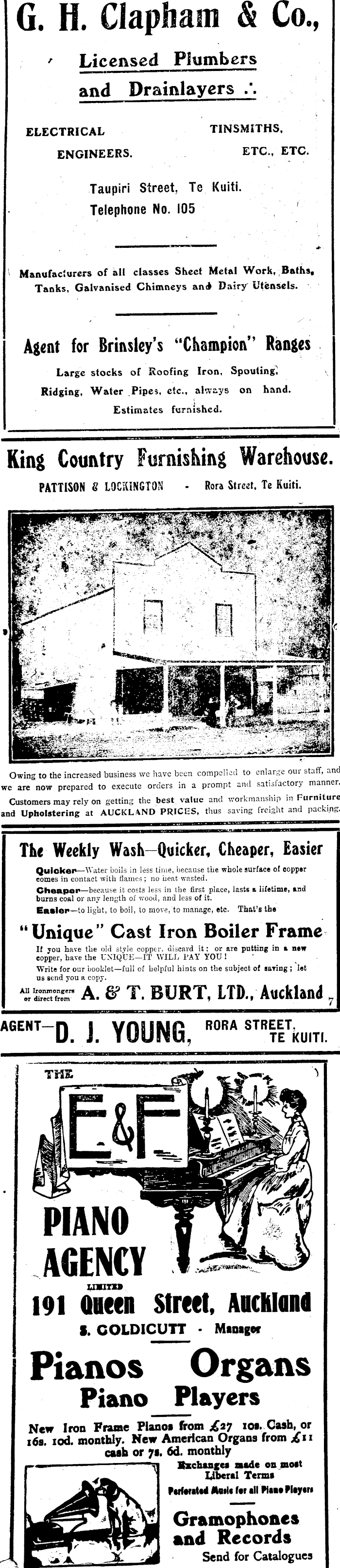 G. H. Clapham & Co., ' Licensed Plumbers and Drainlayers ELECTRICAL TINSMITHS, ENGINEERS. ETC., ETC. Taupiri Street, Tc Kuiti. Telephone No. 105 ' Manufacturers of all classes Sheet Metal Work, Baths, Tanks, Galvanised Chimneys an A Dairy Utensels. Agent for Brinsky's "Champion" Ranges Large stocks of Roofing Iron, Spouting, Ridging, Water Pipes, etc., always on hand. Estimates furnished. King Country Furnishing Warehouse. PATTISON 8 L9CKINGT9N - Rora Street, Tc Kuiti. w m m sg ß V 3f !s*f «fv W Ms *-«■ Vt|» m fci _ :» f. <s*~. Owing to the increased business we have been compelled to enlarge our staff, and we are now prepared to execute orders in a prompt and satisfactory manner. Customers may rely on getting the best value and workmanship in Furniture and Upholstering at AUCKLAND PRICES, thus saving freight and packing. The Weekly Wash—Quicker, Cheaper, Easier Quicker —Water boils in less time, because the whole surface of copper comes in contact with flames ; no heat wasted. Cheaper—because it costs less in the first place, lastE a lifetime, and burns coal or any length of wood, and less of it. Easier—to light, to boil, to move, to manage, etc. That's the "Unique" Cast Iron Boiler Frame If you have the old style copper, discard it; or are putting in a new copper, have the UNIQUE —IT WILL PAY YOU 1 Write for our booklet—full of helpful hints on the subject of saTing ; let us send you a copy. All Ironmongers or direct from A. & T. BURT, LTD., Auckland 7 AGENT D. J. YOUNG RORA STREET. TE KUITI. THE -fr is S PIANO AGENCY LHHD 191 Queen Street, Auckland S. GOLDICUTT - Manager Pianos Organs Piano Players New Iron Frame Pianos from £27 zos. Cash, or 16s. iod. monthly. New American Organs from £ll cash or 7s. 6d. monthly Bkchufci made on most Liberal Terms PtitoaUd Aaii« ftr all Haw Ntym Gramophones and Records Send for Catalogues m It a.