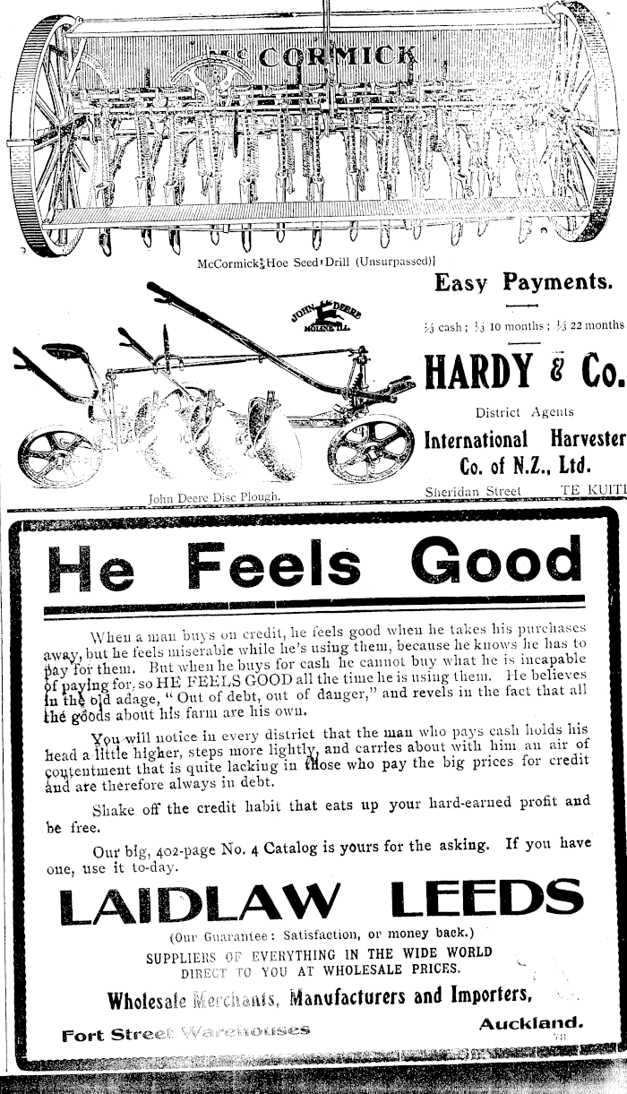 I m m ii •5? m m illMi m I & few I fi iiiiifitll liiiiiiiiiip#^'? ■'' , :.; l~ ; ..!; 'O {i; f is/Af nrJi m. &y it mm m m\ fFjpiT McCormickjiHoe SeediDrill (Unsurpassed)) f'T ■*.ir:-r» m m'fc r * John Deere Disc Plough. Easy Payments. •>3 cash ; }-3 10 months ; Vz 22 months HARDY « Co. District Agents International Harvester Co. of N.Z., Ltd. Sheridan Street FE KUIII He Feels Good When a man buys on credit, lie feels good when he takes l.is purchases away, but he feels miserable while he's using them, because he knows he lias to Savior them. But when he buys for cash he cannot buy what he is incapable £fiJvtna for. so HE FEELS GOOD all the time lie is using them. He believes lnfhf Old adage, " Out of debt, out of danger," and revels m the fact that all g6ods about his farm are his own. You will notice in every district that the man who pays cash holds his hMd a little higher, steps more lightly, and carries about with him an air of contentment that is quite lacking in ftiose who pay the big prices for credit Ind ate therefore always in debt. Shake off the credit habit that eats up your hard-earned profit and be free. Our big, 402-page No. 4 Catalog is yours for the asking. If you have one, use it to-day. LAI DL AW LEEDS (Our Guarantee s Satisfaction, or money back.) SUPPLIERS OF EVERYTHING IN THE WIDE WORLD DIRECT TO YOU AT WHOLESALE PRICES. Wholesale Merchants, Manufacturers and Importers, Fort Street: Warehouses Auckland.