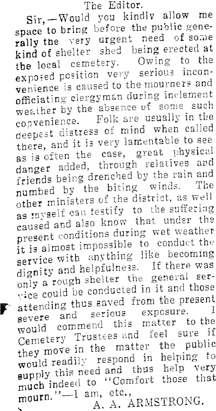 The Editor. gi r —Would vou kindlv allow me space'to bring before the public generally the very urgent need of some kind of shelter shed being erected at the local cemetery. Owing to the expo =ed position very serious inconvenience is caused to the mourners and officiating clergyman during inclement weather by the absence of some_ such convenience. Folk are usually in die deans** distress of mind when called there" and it is very lamentable to see as is 'often the case, great physica danger added, through relatives and f.jends being drenched by the ram and numbed by the biting winds. xne other ministers of the district, as well °s .nv«elf can testify to the suffering caused and also know that under the nresent conditions during wet weather fr is almost impossible to conducttne Iprvieewitb anything like becoming S£n S and helpfulness. If there was nnt" a rough shelter the general ser- ?■• e could be conducted in it and those f from the^resent S eiend this -tter U, the Ppmeterv Trustees and feel B uie 1 fhefmove in the matter the public would readily respond m helping to lv this need and thus help very KcW«d ne to "Comfort those that mourn." I