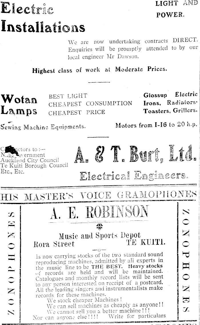 LIGHT AND POWER. We are now undertaking contracts DIRECT. Enquiries will be promptly attended to by our local engineer Mr Dawson. Highest class of work at Moderate Prices. \LT i. BEST LIGHT Glossup Electric WOl&fl CH EAPEST CONSUMPTION Irons, Radiators' CHEAPEST PRICE Toasters, Grillers, Sewing Machine Equipments. Motors from I-I6 to 20 h.p. Te Kuiti Borough Council Etc., Etc. A. E. Music and Sports Depot Rora Street TE KUITI. Is now carrying stocks of the two standard sound reproducing machines, admitted by all experts in the music "line to be THE BEST. Heavy stocks wf records are held and will be maintained. Catalogues and monthly record lists will be sent to any person interested on receipt of a postcard. All the leading singers and instrumentalists make records for these machines. We stock cheaper Machines ! We can sell machines as cheaply as anyone!! We cannot sell vou a better machine !! ! Nor can anyone else ! ! !! Write for particulars