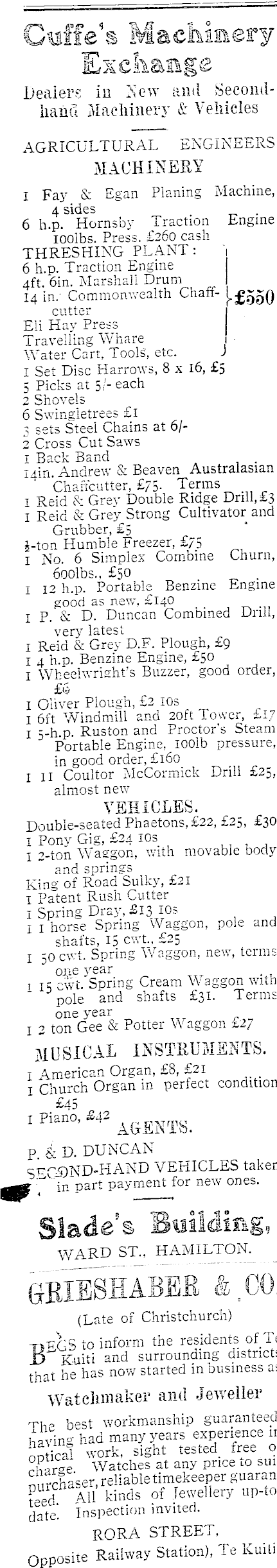 Exeiiange Dealers in New and Secondliana Machinery & Vehicles AGRICULTURAL ENGINEERS MACHINERY I Fay & Egan Planing Machine, 4 sides 6 h.p. Hornsby Traction Engine ioolbs. Press. £260 cash THRESHING PLANT: ', 6 h.p. Traction Engine 4ft. 6in. MarshaFi Drum 14 in; Commonwealth Chaff- [,£550 cutter 1 Eli Hay Press Travelling Whare 1 • Water Cart, Tools", etc. J 1 Set Disc Harrows, 8 x 16, £5 5 Picks at 5r each 2 Shovels 6 Swingietrees £l 3 sets Steel Chains at 6/2 Cross Cut Saws I Back Band . 14m. Andrew & Beaven Australasian Chaftcutter, £/5- Terms I Reid 8- Grev Double Ridge Drill, £3 I Reid & Grey Strong Cultivator and Grubber, £5 J-ton Humble freezer, £75 I No. 6 Simplex Combine Churn, 6001b5., £SO I 12 h.p. Portable Benzine Engine good as new, £l4O I P. & D. Duncan Combined Drill, very latest I Reid & Grey D.F. Plough, £9 I 4 h.p. Benzine Engine, £SO I Wheelwright's Buzzer, good order, £d I Oliver Plough, £2 10s I 6ft Windmill and 20ft Tower, £l7 I 5-h.p. Ruston and Proctor's Steam Portable Engine, lOOlb pressure, in good order, £l6O I 11 Coultor McCormick Drill £25, almost new VEHICLES. Double-seated Phaetons, £22, £25, £3O I Pony Gig, £24 lOs I 2-ton Waggon, with movable body and springs King of Road Sulky, £2l I Patent Rush Cutter 1 Spring Dray, £l3 ios I 1 horse Spring Waggon, pole and shafts, 15 cwt., £25 I 50 cwt. Spring Waggon, new, terms one vear . i ik cwt. Spring Cream Waggon with " pole and shafts £3l. Terms one year I 2 ton Gee & Potter Waggon 2,27 MUSICAL INSTRUMENTS. I American Organ, £B, £2l I Church Organ m perfect condition £45 I Piano, «43 p & D. DUNCAN VEHICLES taken % : " "in part payment for new ones. °*- 4e 5 s Building WARD ST., HAMILTON. JBIESHABER & CO. (Late of Christchurch) to inform the residents of Ts X? Kuiti and surrounding districts that he has now started in business a: Watchmaker and Jeweller The b<=st workmanship guaranteed having had many years experience 11 on ica! work, sight tested free 0 ?w«re Watches at any price lo sui Phaser, reliable timekeeper guaranFeed S kinds of feWellery UP4 ° date". Inspection invited. RORA STREET, Opposite Railway Station), Te Kuili)