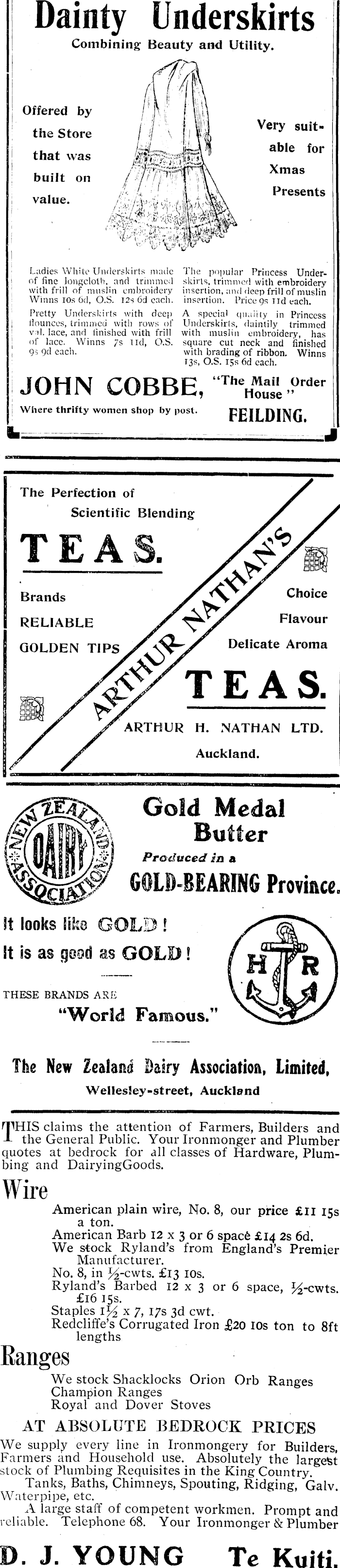 Dainty Underskirts Combining Beauty and Utility. Offered by the Store that was built on value. i*S flu »„ , i) *v *\ If-* 7w-° <l 3 »»-«X Very suit able for Xmas Presents Ladies White Underskirts made of fine longclotW, and trimmed with frill of muslin embroidery Whins 10s 6d, O.S. I2s 6d each. Pretty Underskirts with deep flounces, trimmed with rows of v-'il. lace, and finished with frill of lace. Winns /s lid, O.S. Q3 9d each. The popular Princess Underskirts, trimmed with embroidery insertion, and deep frill of muslin insertion. Price 9s lid each. A special qu.iiity in Princess Underskirts, daintily trimmed with muslin embroidery, has square cut neck and finished with brading of ribbon. Winns 13s, O.S. 15s 6d each. JOHN COBBE, " The H lt" rder Where thrifty women shop by post. pplf FHlVf* The Perfection of Scientific Blending Brands RELIABLE GOLDEN TIPS Choice Flavour Delicate Aroma TEAS. ARTHUR H. NATHAN LTD. Auckland. Produced in a !t looks like GOLD! It is as 1 THESE BRANDS ARE "World Famous." The New Zealand Dairy Association, Limited, Wellesley-street, Auckland THIS claims the attention of Farmers, Builders and the General Public. Your Ironmonger and Plumber quotes at bedrock for all classes of Hardware, Plumbing and Dairying Goods. American plain wire, No. 8, our price £ll 15s a ton. American Barb 12 x 3 or 6 space £l4 2s 6d. We stock Ryland's from England's Premier Manufacturer. No. 8, in %-cwts. £l3 10s. Ryland's Barbed 12 x 3 or 6 space, %-cwts £l6 15s. Staples Redcliffe's Corrugated Iron £2O 10s ton to Bft lengths We stock Shacklocks Orion Orb Ranges Champion Ranges Royal and Dover Stoves AT ABSOLUTE BEDROCK PRICES We supply every line in Ironmongery for Builders, Farmers and Household use. Absolutely the largest stock of Plumbing Requisites in the King Country. Tanks, Baths, Chimneys, Spouting, Ridging, Galv. Waterpipe, etc. A large staff of competent workmen. Prompt and reliable. Telephone 68. Your Ironmonger & Plumber .J. YOUNG Tc Kuiti.