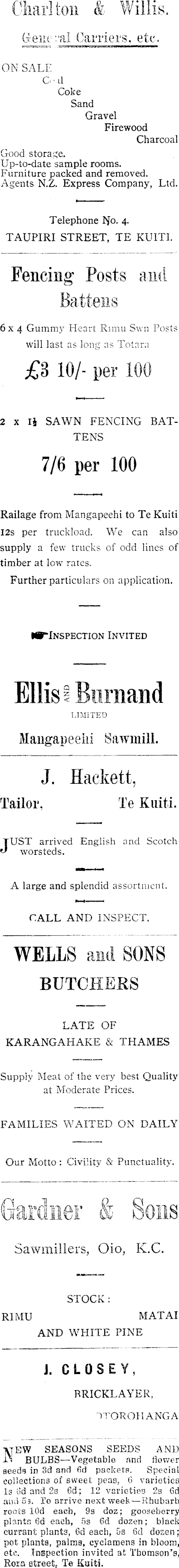 ON SALE G-.il Coke Sand Gravel Firewood Charcoal Good storage. Up-to-date sample rooms. Furniture packed and removed. Agents N.Z. Express Company, Ltd. Telephone No. 4. TAUPIRI STREET, TE KUITI. Fencing' Posts and 6x4 Gummy Heart Rimu Swn Post will last as lone as Totara £3 10/- per 10( 2 x IJ SAWN FENCING BATTENS 7/6 per 100 Railage from Mangapeehi to Te Kuiti I2s per truckload. We can also supply a few trucks of odd lines of timber at low rates. Further particulars on application. ■•"lnspection Invited Ellis ißurnand LIMITED Mangapeehi Sawmill. J. Hackett, ailor, Te Kuiti. JUST arrived English and Scotch worsteds. A large and splendid assortment. CALL AND INSPECT. WELLS and SONS BUTCHERS LATE OF KARANGAHAKE & THAMES Supply Meat of the very best Quality at Moderate Prices. FAMILIES WAITED ON DAILY Our Motto : Civility & Punctuality. Gardner & Sons Sawmillers, Oio, K.C. STOCK MATAI AND WHITE PINE J. GLQSEY, RRICKLAYER, ITOROHANGA VTEW SEASONS SEEDS AND lS BULBS—Vegetable and flower seeds in 3d and fid packets. Special collections of sweet peas, 6 varieties Is Gd and 2s 6d; 12 varieties 2s 6d and ss. To arrive next week—Rhubarb roots lOd each, 9a doz; gooseberry plants 6d each, 5s 6d dozen; black currant plants, (3d each, 5s 6d dozen; pot plants, palmß, cyclamens in bloom, etc. Inspection invited at Thomson's, Rora street. Te Kuiti.